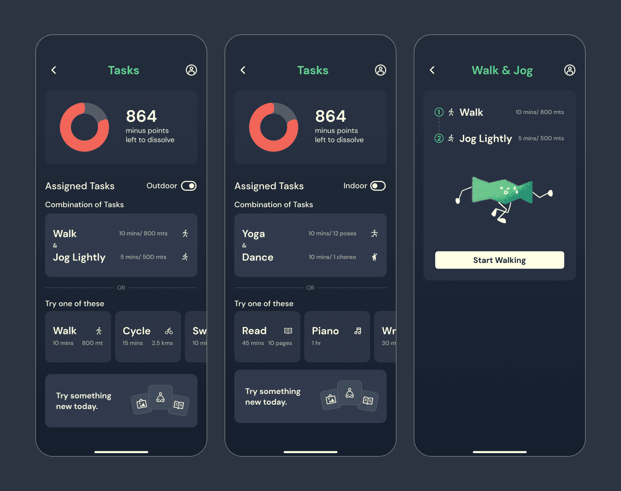 The interface was meant to rest the eyes and quiet the mind. We used a dark, teal-based palette, minimal contrast, and clean typography to keep everything simple and light.
